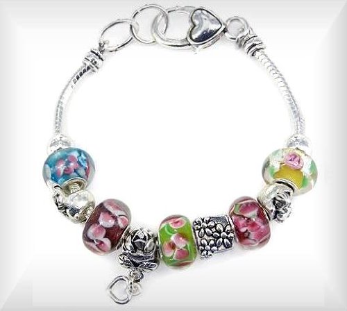 Pandora Style Bracelet with spring color glass beads accented with flowers, angel, small girl gathering flowers, basket of flowers, dangle heart all sliding bead charms. These beads are not interchangeable which means they cannot be removed or replaced with other beads. This Pandora Style Bracelet is great for best friends mothers grandmothers daughters Teachers and other professional women and represents innovative and International Scandinavian jewelry at its very best. Each Pandora style Bracelet is handmade by dedicated men and women for self-confident and romantic women who appreciate the beautiful style and quality. This is a wonderful gift for the jewelry loving gal, younger or older, also a great Teacher Appreciation gift and as well as other staff and office personnel. This bracelet has a lobster claw closure clasp. The colors are exquisite and beautiful and bracelet measures 7 1/2".